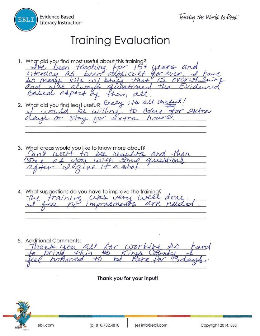 and demonstration lessons. I am happy to report that each teacher has begun using the EBLI system in their classrooms and they are already seeing their students succeed. Best of all, teachers are seeing positive